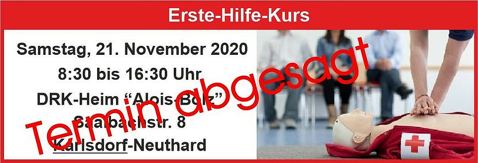 Nach der Absage unserer DRK-Kursangebote im März aufgrund der Corona Pandemie war es ab September wieder soweit. So haben wir aufgrund der großen Nachfrage bereits im September zwei Erste-Hilfe-Kurse in der Breitenausbildung der Bevölkerung in unserem DRK-Heim "Alois-Bolz" in der Saalbachstr. 8 im OT Karlsdorf durchgeführt. Der nächste Erste-Hilfe-Kurs in unserem DRK-Heim findet am Samstag, 21. November 2020, 8:30 - 16:30 Uhr statt. Die Erste-Hilfe-Kurse finden kontaktlos unter Einhaltung der geltenden CORONA-SchutzmaßnahmenAbstand - Hygiene - Alltagsmaskestatt, um das Risiko einer Ansteckung mit dem Corona-Virus für die Teilnehmer*innen und Ausbilder*innen so gering als möglich zu halten. Auf Tische wird verzichtet, um Kontaktflächen zu reduzieren. Alle Flächen und Kontaktbereiche sowie die Übungsmaterialien werden regelmäßig und umfassend desinfiziert. Auch Sicherheitsabstände sind sichtbar gekennzeichnet. Während des gesamten Seminars ist die Bedeckung von Mund und Nase Pflicht. Für Fördermitglieder des DRK Ortsverein Karlsdorf übernehmen wir einmalig die Kursgebühr für einen EH-Lehrgang. Informieren Sie zu Beginn des Kurses unsere EH-Ausbilderin Katharina Schäfer entsprechend, am besten unter Vorlage Ihres DRK-Mitgliedsausweises oder unter Angabe Ihrer DRK-Mitgliedsnummer. Der Erste-Hilfe-Lehrgang wendet sich an alle Interessierten, da keinerlei Vorkenntnisse erforderlich sind. Der Kurs umfasst 9 Unterrichtseinheiten und ist auch für Führerscheinbewerber der Klasse A, B, C, C1, CE, CIE, D, D1, DE und DIE sowie für Übungsleiter inSportvereinen, betriebliche Ersthelfer, Lehramtsstudenten etc. Jetzt anmelden:Sie können sich über die Internetseite unseres DRK Kreisverband Karlsruhe e. V. direkt online für unseren Erste-Hilfe-Kurs anmelden. Sie sehen dort eine Übersicht aller angebotenen EH-Kurse im DRK KV Karlsruhe e. V. und auch gleich die Anzahl der noch freien Plätze: